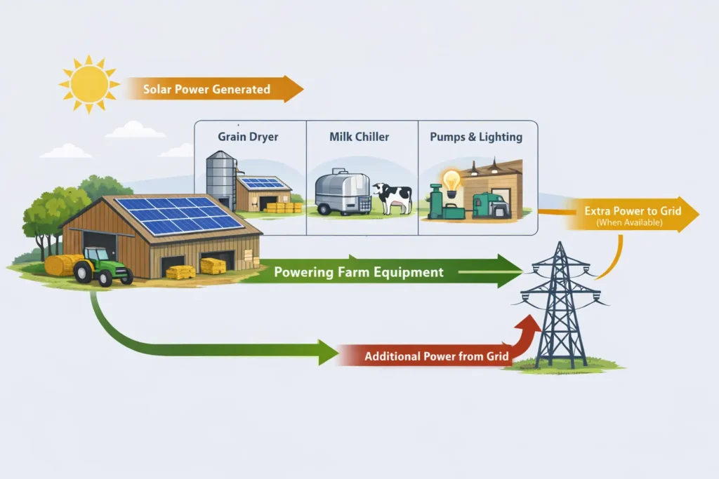 What makes agricultural solar different is timing. Many farm operations draw power steadily through the day, particularly during harvesting, drying, or milking cycles. When generation aligns with these loads, solar becomes a practical energy input rather than a passive investment.